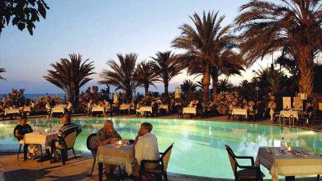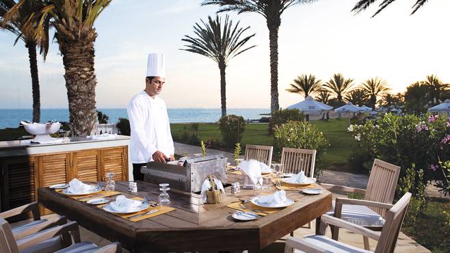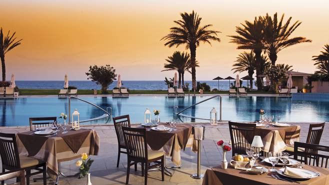Предлагает богато накрытый буфет в любое время суток. Здесь вы сможете попробовать как традиционные блюда Кипра, так и сдобренные пряностями яства Востока.