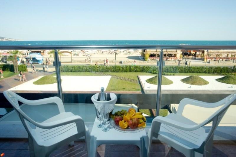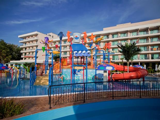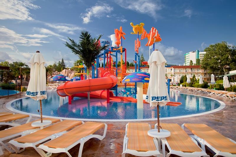 Это один из самых востребованных отелей для отдыха с детьми. Лежит на первой линии пляжа курорта Солнечный Берег, гордится великолепным аквапарком. Зонтами и лежаки бесплатны для гостей отеля. Кроме аквапарка есть и мини-клуб, шесть ресторанов, ряд баров и анимационная программа. Вкусно кормят и услужливый персонал, многие говорят по-русски.