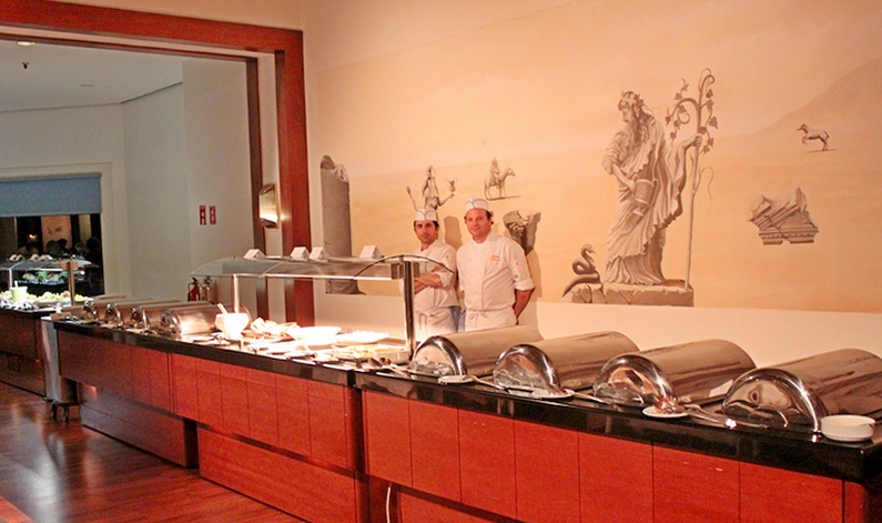 Холодные и горячие закуски, блюда интернациональной кухни, разнообразие мяса, рыбы, овощей, салатов и различных десертов (12:30 -15:00 часов)