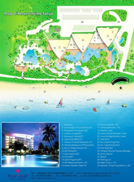 Отель Resort Intime Sanya 5* очень удачно расположен – здесь отсутствует дорога между пляжем и отелем. Рядом с отелем множество магазинчиков, ресторанов. Так что Вы всегда сможете сделать выбор – провести день в спокойной и романтической обстановке или же прогуляться по шумному городку.