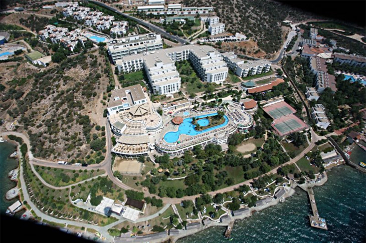 Отель Bodrum Holiday Resort & Spa 5* расположен на побережье Эгейского моря в живописной бухте недалеко от поселка Ичмелер; до курортного центра Бодрум всего 10 минут езды на автобусе. До аэропорта – 37 км. Одновременно здесь могут расположиться до 1500 отдыхающих. Сам отельный комплекс состоит из главного корпуса в 6 этажей, одного корпуса в 1 этаж и 18 трехэтажных зданий.
