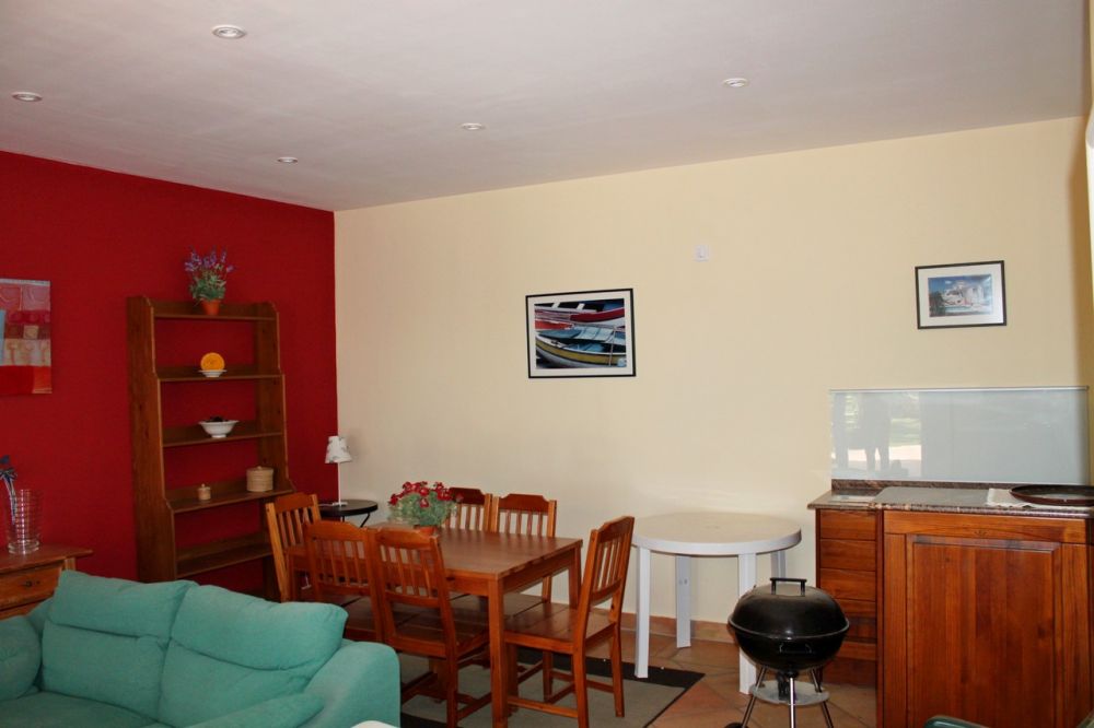 Нижний этаж дома с крытой террасой и столовой имеет удобный выход в сад и к бассейну. Здесь же ещё одна спальня и душевая кабина.