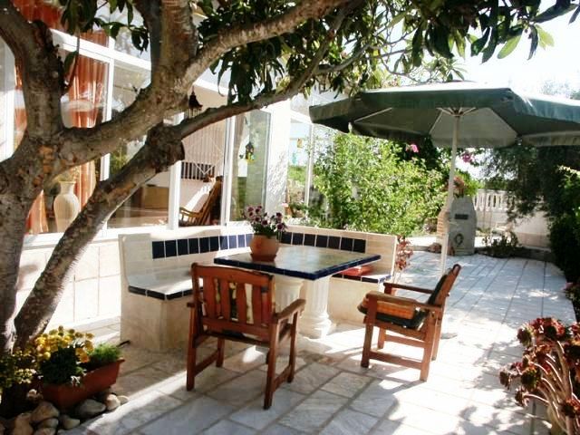 Месторасположение дома / Земельный участок:Земельный участок имеет площадь 2.007 м ², огорожен, на нём создан и ухожен красивый ландшафт. На территории между домом и мастерской есть бассейн 5 м x 10 м с открытым душем, а также парковка под крышей на 2 автомашины. Большая часть участка засажена различными фруктовыми деревьями (около 70), в том числе мандаринами, апельсинами, гранатами, инжиром и оливами. Для орошения служит автоматическая система полива. От площадки бассейна открывается красивая панорама окрестностей.